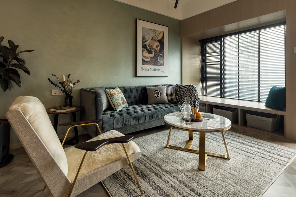 復古混搭風格室內家裝設計,客廳色彩追求時尚且協調,大理石搭配金色元素組合的圓茶幾和北歐風地毯相結合,在整體風格中減輕了色彩飽和度,視覺空間隨之延伸。