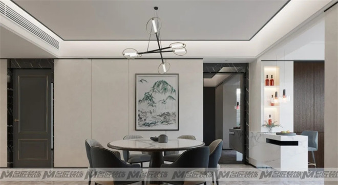 舒適圈的生活不能待太久,要走出來。設計更加如此,適當的沖突有其存在意義。不破不立是沖突更是再平衡,這也是設計存在的意義。平衡之術運用在每一個場景里,如同客廳里那一塊藝術背景墻,與茶幾上的盆栽遙遙相望,平衡左右。切割撕裂后又將其揉合平衡是趣味所在。