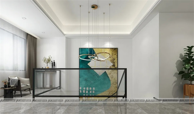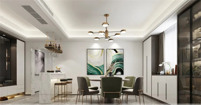 餐廳的設計延續了現代輕奢的風格,整體呈現內涵品質的理想生活場景。墻體抽象畫和餐桌椅的顏色相得益彰,羅列的擺件增添了空間細節感悄悄地打動人心。一側的餐邊儲物柜美觀大方且實用,一切都剛剛好,彰顯優雅舒適。