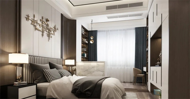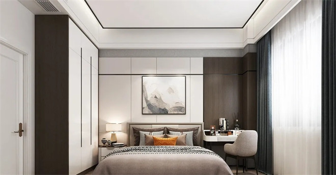 簡約的木飾面床背景,搭配灰咖色床品和同色系人字紋地毯,勾勒出和諧沉謐的美感。半面胡桃木色的墻面,與床背景、衣柜和諧且統一,充滿高級感。暖色系的燈光,中和了空間的冷色搭配,帶來了溫度。