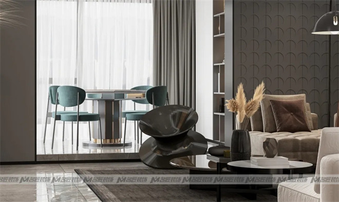 別具一格的客廳設計,突破以往設計的傳統(tǒng)界限,構筑了一個大方而獨特的空間。沙發(fā)背景墻采用帶有立體感的深灰色硬包拼接白色墻面,咖色絲絨沙發(fā)拼接白色布藝沙發(fā)與之銜接,在不同材質的碰撞下,明與暗的對比下,達到空間錯落有致的視覺感以及層次感。壁爐里的熊熊火焰,讓身心與視覺融起暖意。想象在寒冷的冬日里,在火光的映照下,與家人看一部電影,聽時光緩慢流淌的聲音,這該是多么享受的事情。