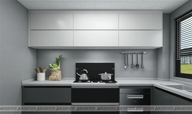 廚房內部做了L字型的布局方案,讓廚房擁有更多的儲物空間,功能分區(qū)有所側重,比較靈活多變。白色吊柜與深灰色櫥柜承上啟下,延續(xù)空間深淺搭配的風格,不顯單一枯燥。