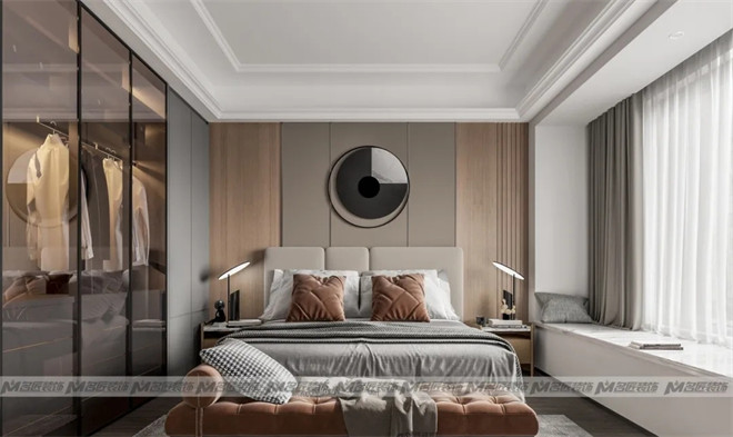 主臥的床背景是木飾面+咖色硬包拼接,并以充滿設計感的立體掛飾作為點綴,增添了時尚感。床頭兩側造型前衛(wèi)的臺燈,簡潔不失創(chuàng)意,與臥室風格渾然一體。