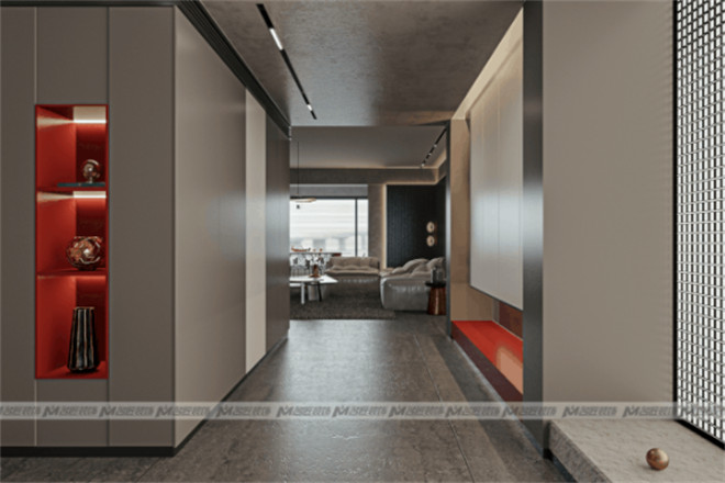 主臥以高級灰作為肌底,純粹內斂的質感給予人情緒上的安撫,注入紅色軟裝,出現在裝飾畫、抱枕、床頭柜上,將張揚與低調銜接和諧,凸顯優雅格調。