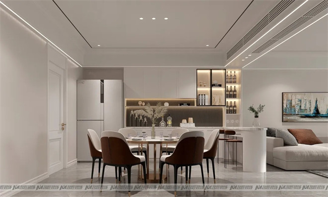 餐桌椅在色調(diào)和材料的使用上,保持了整體家具的連貫性,米白色拼接紅棕色的餐椅,搭配金屬鑲邊的大理石餐桌,精致感十足,讓用餐的儀式感滿滿。