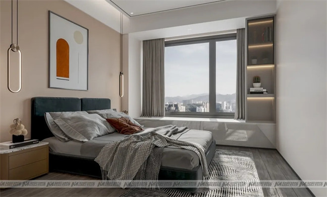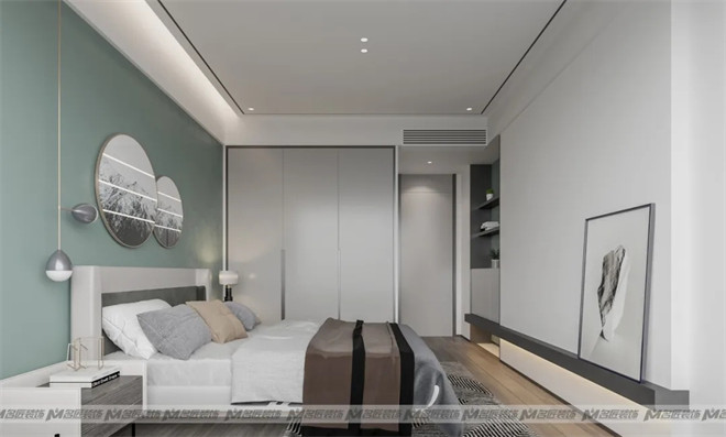 主臥的基調(diào)設(shè)計打破固化的審美觀,采用清新治愈的馬卡龍綠色作為床頭背景墻顏色,鋪上灰色木地板,裝點色彩和諧的吊燈、印象畫、掛畫等軟裝元素,鑲嵌上些許金邊,凸顯輕奢之美,簡潔而浪漫,這是心動的感覺!