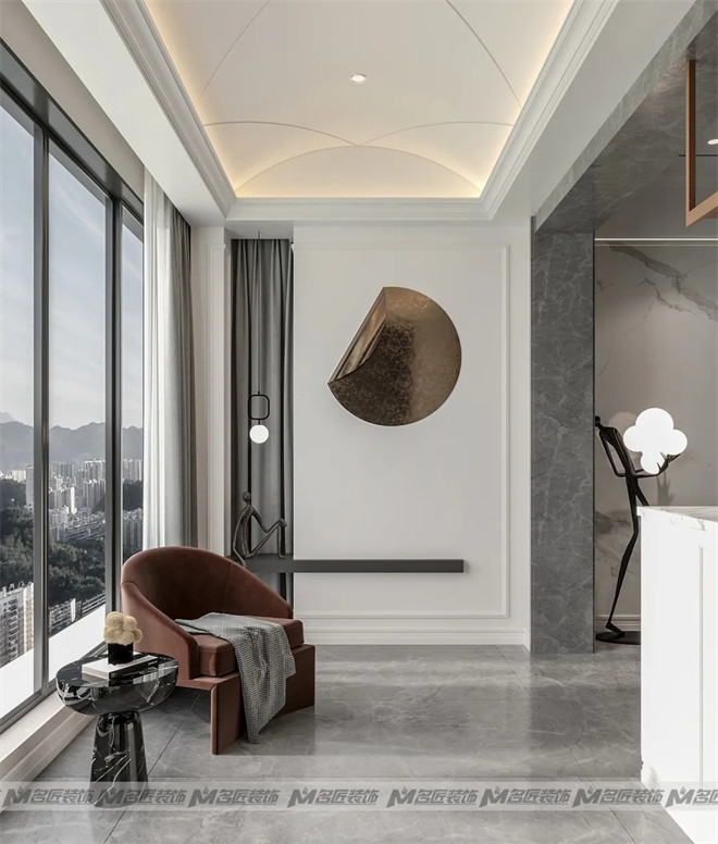 高級感的玄關(guān)設(shè)計,以白色和灰色作為主要基調(diào),利用富有創(chuàng)意的金屬掛件及黑色抽象雕塑豐富空間,在極簡的吊燈襯托之下描摹出優(yōu)雅的格調(diào)。