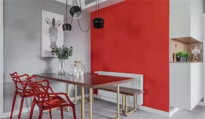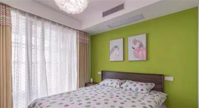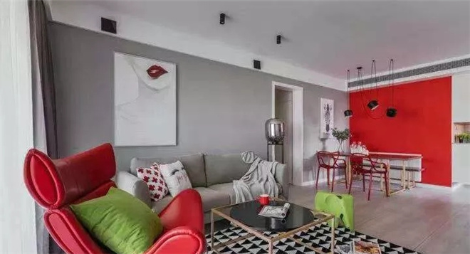 客廳是交友的娛樂中心。可以看到整體線條簡約流暢,點綴色彩對比強烈!客廳的影視墻采用的是淺色乳膠漆打底,既大方又很有氣派。喜歡北歐風格,但又不希望被單調的白色拘束,設計師最終給了小夫妻驚喜。