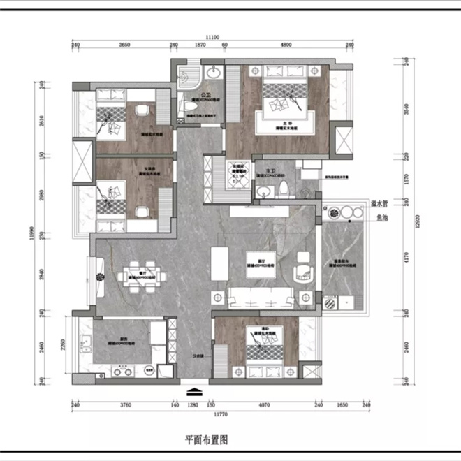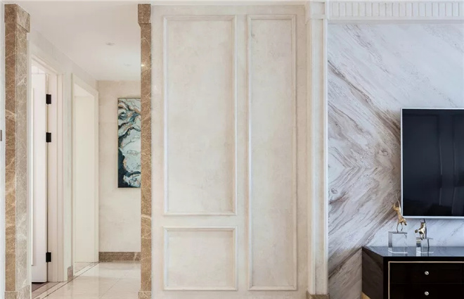 主臥一個衣柜很難滿足儲納需求,同時本案業主提出增加儲納柜來緩解家庭的儲物壓力。因此將兩個洗手間的使用性質進行調整(主衛變公衛,公衛變主衛)。針對原公衛過于狹長的的不足,縮短該空間長度。同時增設一個衣帽間,很好的解決了本案業主對衣柜的需求。
