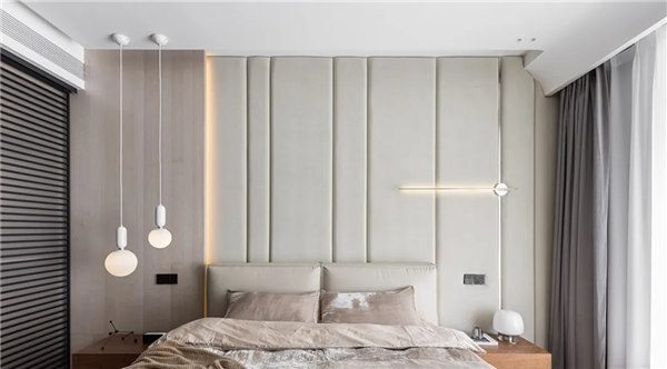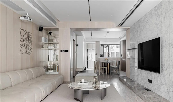 全屋采用無主燈和局部線性燈光設計,營造放松、溫馨氛圍,整體以白色、淺色的木飾面為主,搭配小面積的鏡面穿插,融合自然紋理的石材點綴,通過對材質、細節的整合把控,進一步達到對空間本身的塑造以讓心靈找到歸屬
