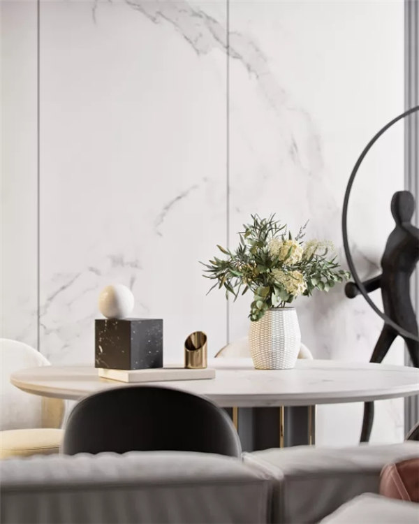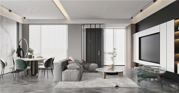 客廳地面采用灰色大理石,佐以白色大理石墻面,簡潔并具有個性的視覺空間。灰色彩布滿整個空間,在裝飾中加以流行元素,點(diǎn)綴著綠植,整個客廳空間彌漫著濃濃的雅奢氣質(zhì)。