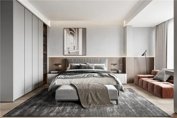 米黃色紋理地毯,搭配大地色系床品,沉靜溫和的感覺,質(zhì)感十足。色彩搭配舒適高級,無棱角的家具與陳設(shè)造型慵懶隨性,為空間帶來寧靜氛圍和藝術(shù)性美感,增添無限柔情浪漫。