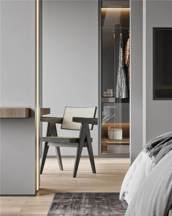 主臥無主燈設(shè)計(jì),局部分散的照明,不僅實(shí)用還讓客廳更有層次感與格調(diào),放棄復(fù)雜造型的吊頂,使用隱藏筒燈和臺燈寬敞大方。臺燈散發(fā)出的柔和燈光,的與空間色調(diào)完美融合,散發(fā)著柔和光芒,輕奢而不張揚(yáng)。