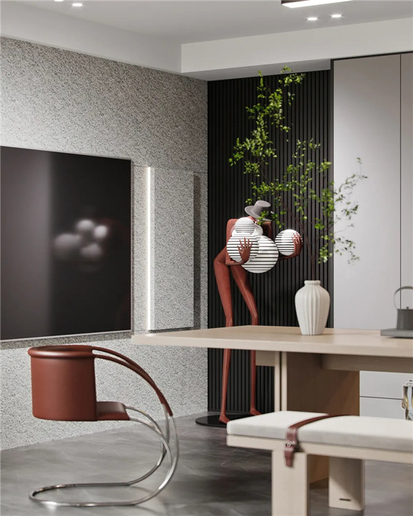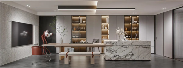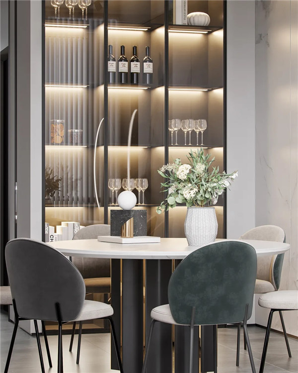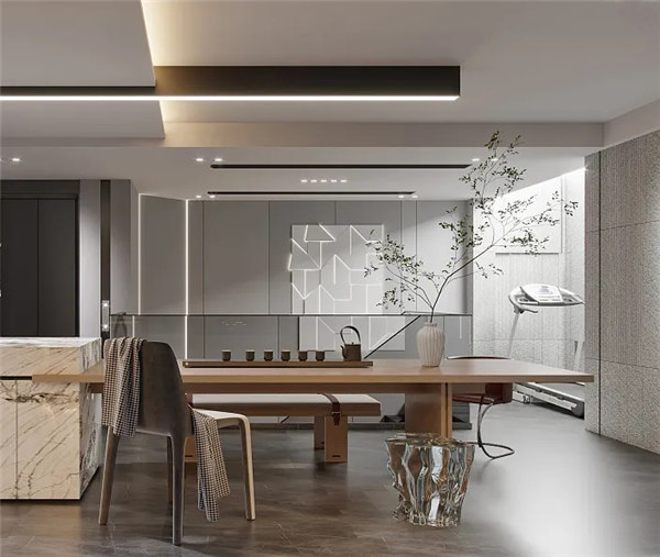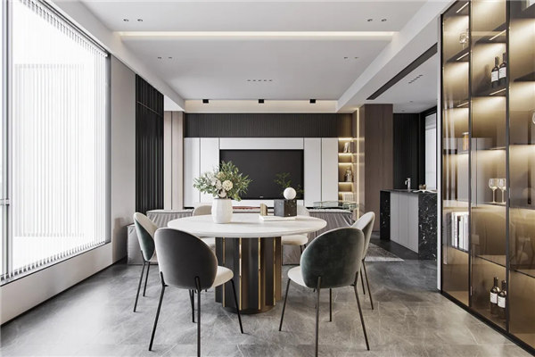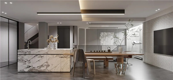 餐廳色調(diào)個性,以灰色餐椅搭配米白色坐墊,白色大理石臺面,搭配無主燈,與客廳遙呼相應(yīng)。撞色設(shè)計(jì)與線條交錯有致,讓空間顯得飽滿,富有層次。不張揚(yáng)的奢華才是兼顧生活品質(zhì)與卓越風(fēng)范的展現(xiàn)。