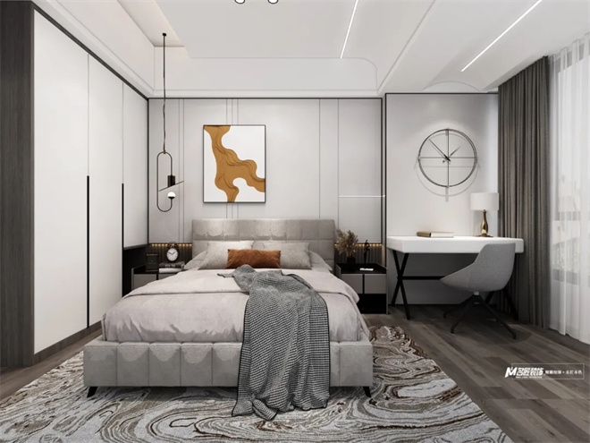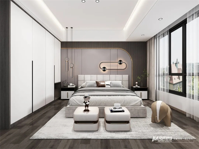 臥室中色彩靈活運用,形成自然靈動又不失沉靜的環(huán)境,大面落地窗保證了空氣,光影與人動線的流暢性