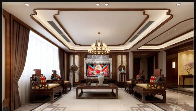 客廳是傳統與現代居室風格的碰撞,設計師以現代的裝飾手法和家具,結合古典中式的裝飾元素,來呈現亦古亦今的空間氛圍。