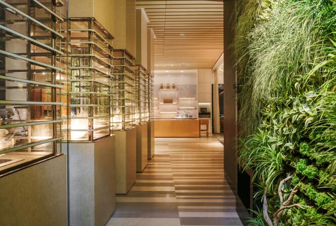 長(zhǎng)廊的盡頭是一面擺放著各種茶具的展示墻,其前方是一個(gè)精致的木雕茶歇臺(tái),賓客可以在此處從品種齊全的上等茶葉中任意甄選。