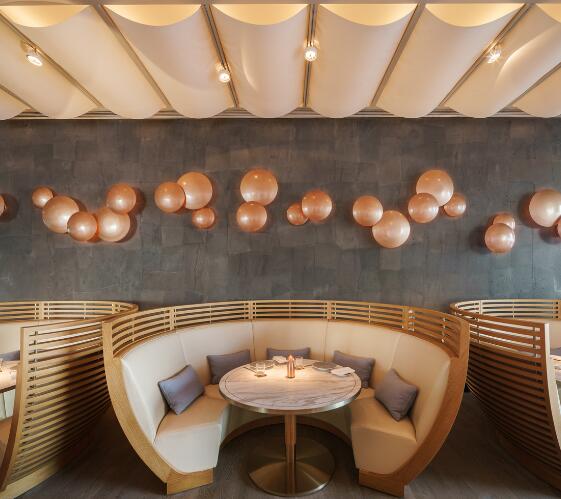 此外還專門設(shè)計(jì)了三個(gè)半圓席座,以供賓客近距離參觀廚師的工作場(chǎng)景,席座背面采用了西西里島熔巖墻裝飾。