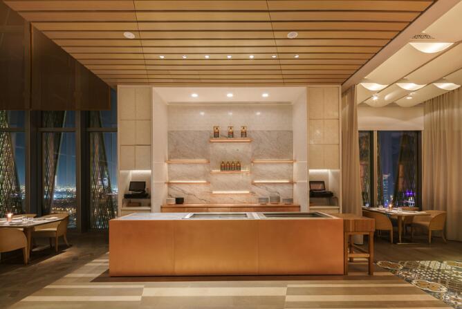 入口長(zhǎng)廊的左側(cè)是前用餐區(qū),挑高 12 米的天花令空間更顯開闊大氣,整座城市和遠(yuǎn)方波斯灣的壯美風(fēng)光盡收眼底。窗前還安裝了獨(dú)家定制的金屬網(wǎng)簾,在漫射燈光系統(tǒng)的照耀下,閃耀著柔和的光彩。