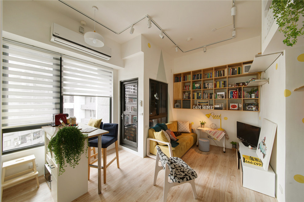 打開格局,調整動線,空間開放,陽光自然就進來了。省去一向為空間要角的電視墻,讓男主人多年藏書作為裝飾主角,書柜下妥善安置了舊沙發及邊桌,完成了麻雀雖小卻實用精美的客廳空間。